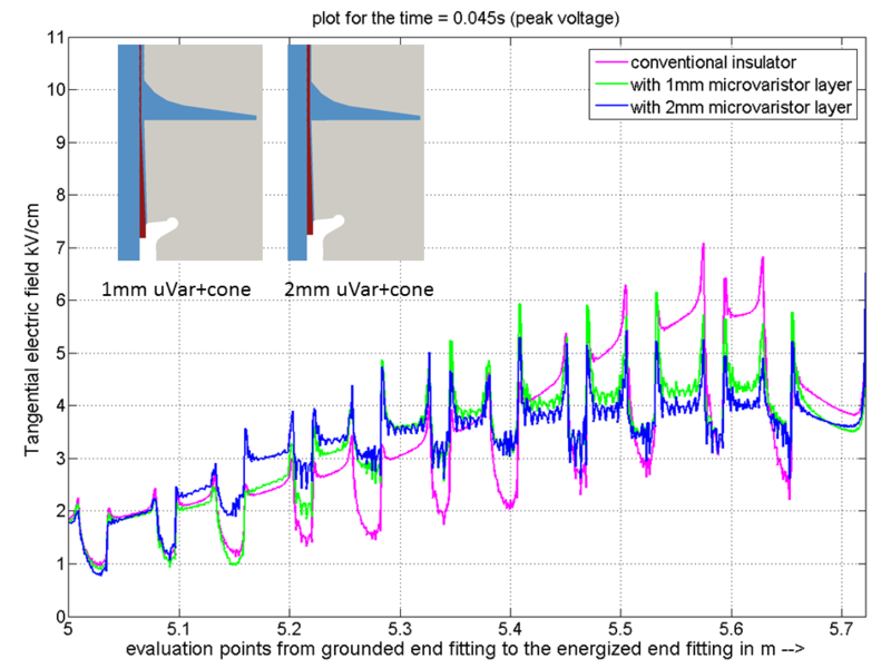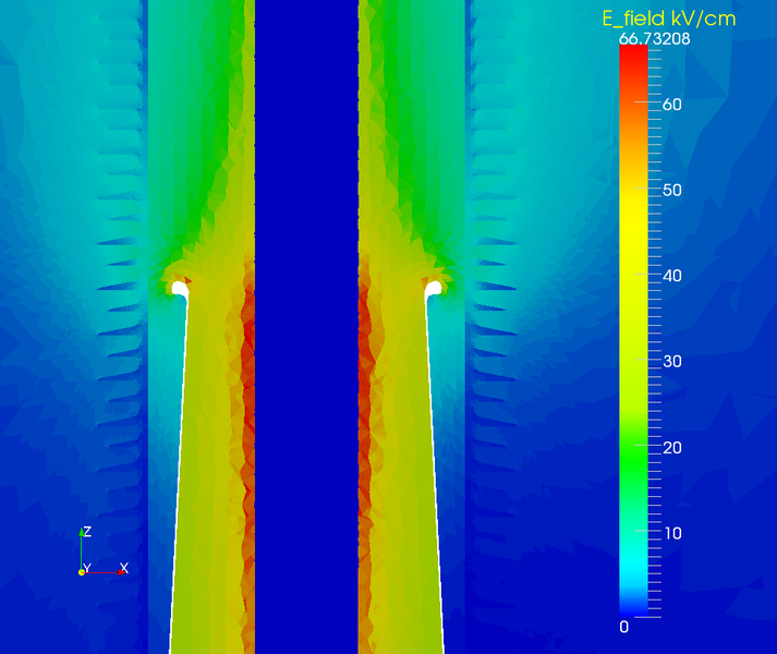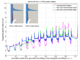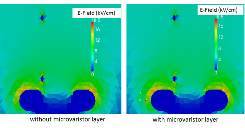 We aided the product development of the Lapp Insulators GmbH with their non linear low frequency high voltage problems, that could not be solved with commercial of the shelf components due to their extremely ill conditioned nature. For this we developed robust and efficient finite element method (FEM) time domain solvers that are able to solve large scale problems featuring nonlinear materials (permittivity and conductivity) and provided numerical analysis for coupled thermo-electrical problems as well.If you have any specific problems, please contact us.